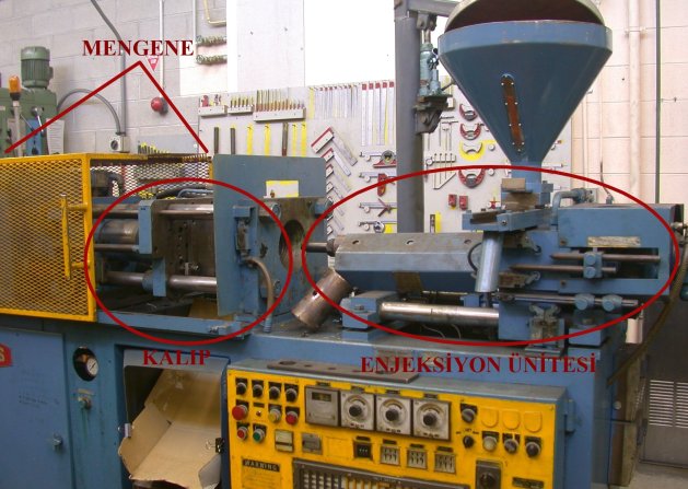 - Enjeksiyon ünitesindeki haznede yer alan granül halindeki plastik hammadde elektrikli ısıtıcılarla yüksek sıcaklığa ulaştırılır. Ergimiş olan hammadde mengene kısmındaki kalıp bölümüne itilir. Bu itme işlemi, kalıbı doldurana dek sürer.