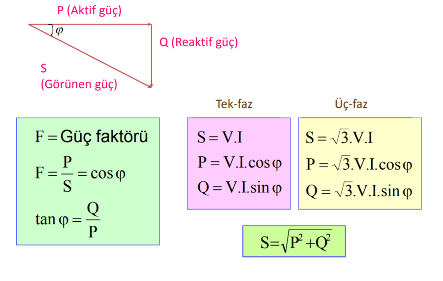 Aktif güç, Reaktif güç ve Görünür güçler arasındaki bağıntıyı gösteren üçgene güç üçgeni denir. Endüktif bir devrenin uçlarına bir gerilim uygulandığında devre, geriliminden geri fazda bir akım çektiğinden endüktif devrelerde akım geriliminden 90 derece geridedir denilirken kapasitif devrelerde ise devrenin uçlarına gerilim uygulandığında devre geriliminden ileri fazda bir akım çektiğinden kapasitif devrelerde akım geriliminden 90 derece ileridedir denilir.